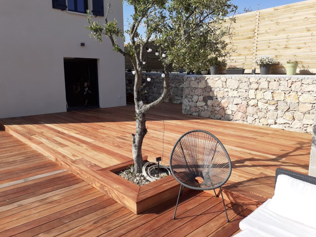 Le Muiracatiara est un bois exotique haut de gamme, réputé pour son aspect très décoratif aux veinages contrastés et sa durabilité exceptionnelle. Il offre une excellente résistance en extérieur tout en apportant un rendu visuel unique.